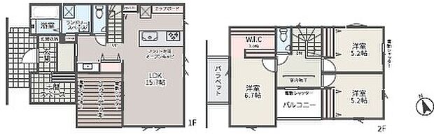 | 間取り | 3LDK 間取り内訳:リビングダイニングキッチン 15.7帖(1階)・洋室 6.7帖(2階)・洋室 5.2帖(2階)x2・その他 1帖(2階) |