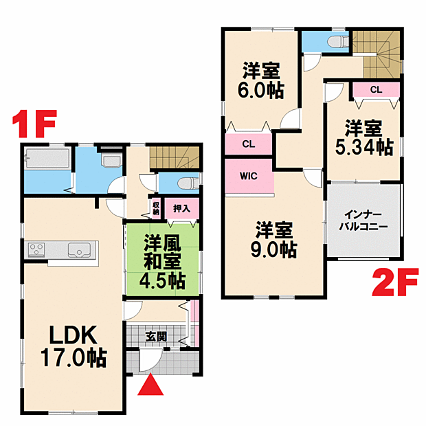 間取り内訳:和室 4.5畳(1階)・洋室 9帖(2階)・洋室 6帖(2階)・洋室 5.3帖(2階)・リビングダイニングキッチン 17帖(1階)