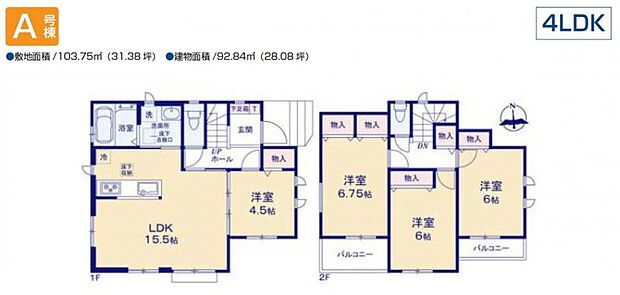 | 間取り | 4LDK 間取り内訳:リビングダイニングキッチン 15.5帖(1階)・洋室 4.5帖(1階)・洋室 6.7帖(2階)・洋室 6帖(2階)x2 |