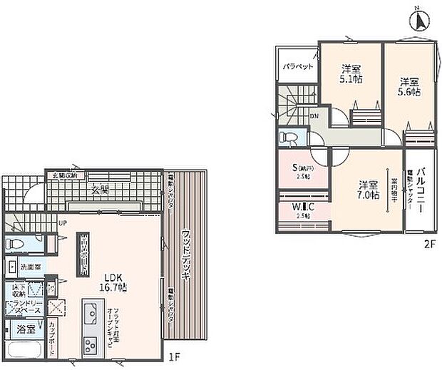| 間取り | 3LDK 間取り内訳:リビングダイニングキッチン 16.7帖(1階)・洋室 7帖(2階)・洋室 5.6帖(2階)・洋室 5.1帖(2階)・収納 2.5帖(2階)・その他 2.5帖(2階) |