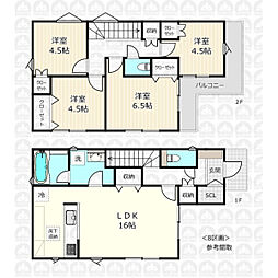 | 間取り | 3LDK 間取り内訳:リビングダイニングキッチン 16帖(1階)・洋室 6.1帖(2階)・洋室 5.2帖(2階)・洋室 4.5帖(2階) |