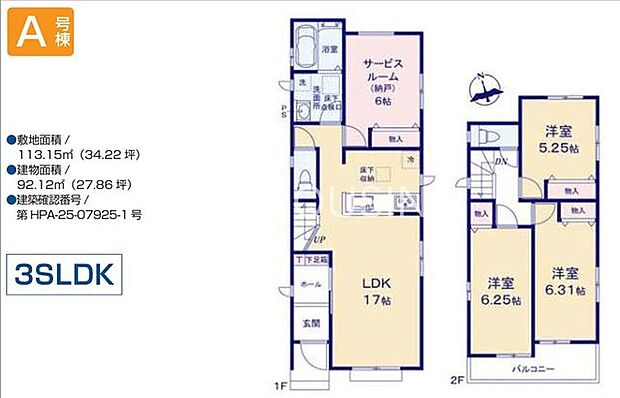 | 間取り | 3SLDK 間取り内訳:洋室 5.2帖(2階)・リビングダイニングキッチン 17帖(1階)・収納 6帖(1階)・洋室 6.3帖(2階)・洋室 6.2帖(2階) |
