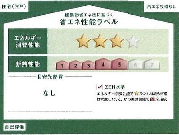 - 星マークの数が多いほどエネルギー消費性能が高いことを示しています。再エネ設備のない住宅は★0~★4の5段階評価、再エネ設備がある住宅は★0~★6の7段階評価となります。