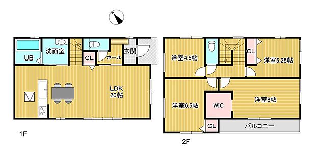 | 間取り | 4LDK 間取り内訳:リビングダイニングキッチン 20帖(1階)・洋室 4.5帖(2階)・洋室 6.5帖(2階)・洋室 5.2帖(2階)・洋室 8帖(2階) |