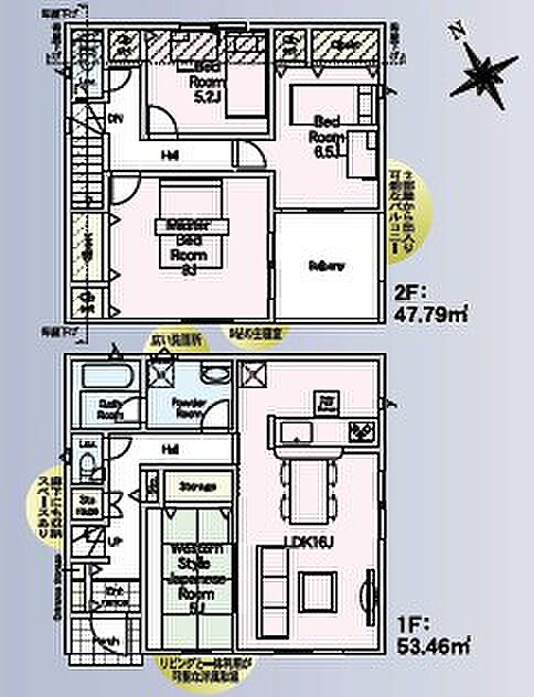 | 間取り | 4LDK 間取り内訳:リビングダイニングキッチン 16帖(1階)・和室 5畳(1階)・洋室 9帖(2階)・洋室 6.5帖(2階)・洋室 5.2帖(2階) |