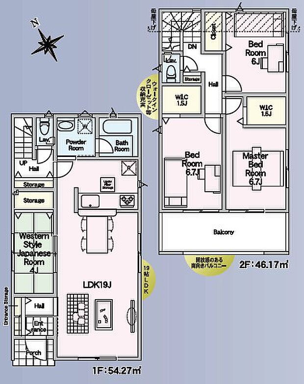 | 間取り | 4LDK 間取り内訳:リビングダイニングキッチン 19帖(1階)・和室 4畳(1階)・洋室 6.7帖(2階)x2・洋室 6帖(2階) |