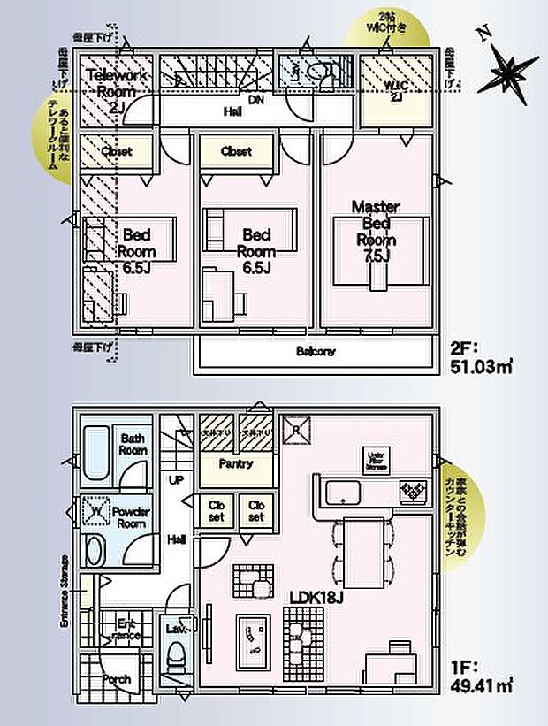 | 間取り | 3LDK 間取り内訳:リビングダイニングキッチン 18帖(1階)・洋室 7.5帖(2階)・洋室 6.5帖(2階)x2・洋室 6.5帖(2階)・その他 2帖(2階) |