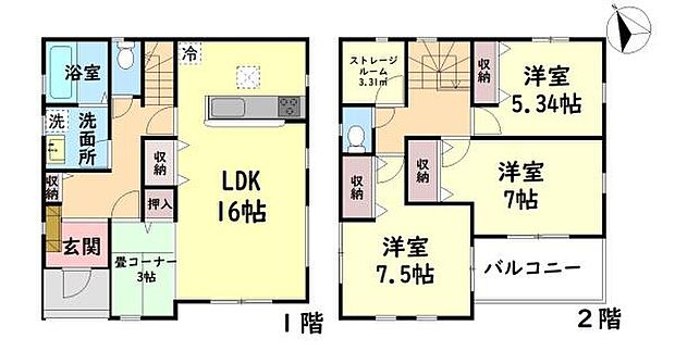 | 間取り | 3SLDK 間取り内訳:リビングダイニングキッチン 19帖(1階)・洋室 7.5帖(2階)・洋室 7帖(2階)・洋室 5.3帖(2階) |