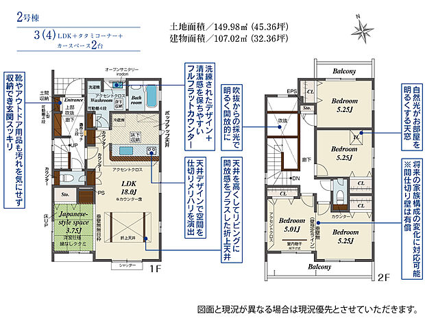 | 建物面積 | 107.02m2(約32.37坪)~108.56m2(約32.83坪) | ||