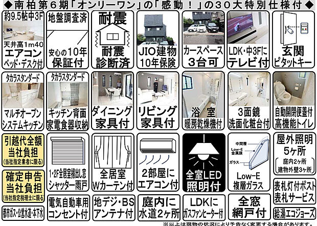 【新生SBI銀行全額ローン可(諸費用含む)毎月払約9.6万円、年収430万円以上で可】(夫婦収入合算可)※その他銀行の取扱いもあります 【南柏駅よりバス約10分バス停より約200m】【大型5LDK(中3F含)2ランク上のフル装備邸宅】エアコン2台、家具、テレビ付TVボード、全洋室Wカーテン、全室照明付 【売主直売】「省エネ基準適合住宅」ローン控除還付金13年間で総額最大273万円 「地震に強い家」国交省認定震度6強~7の地震に対し最高評点1.50以上取得 地盤調査済10年保証付 建物10年保険付