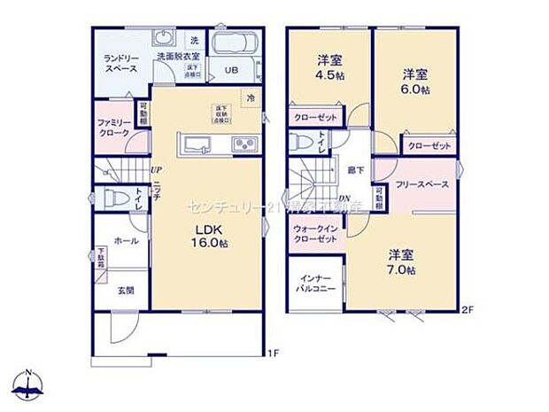 | 間取り | 3LDK 間取り内訳:リビングダイニングキッチン 16帖(1階)・洋室 7帖(2階)・洋室 6帖(2階)・洋室 4.5帖(2階) |