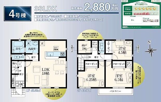 | 間取り | 3SLDK 間取り内訳:リビングダイニングキッチン 18帖(1階)・洋室 6.5帖(2階)・洋室 6.2帖(2階)・洋室 4.5帖(2階)・収納 2帖(2階) |