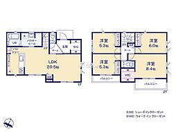| 間取り | 4LDK 間取り内訳:洋室 5.3帖(2階)・洋室 5.3帖(2階)・リビングダイニングキッチン 20.5帖(1階)・洋室 8.4帖(2階)・洋室 6帖(2階) |