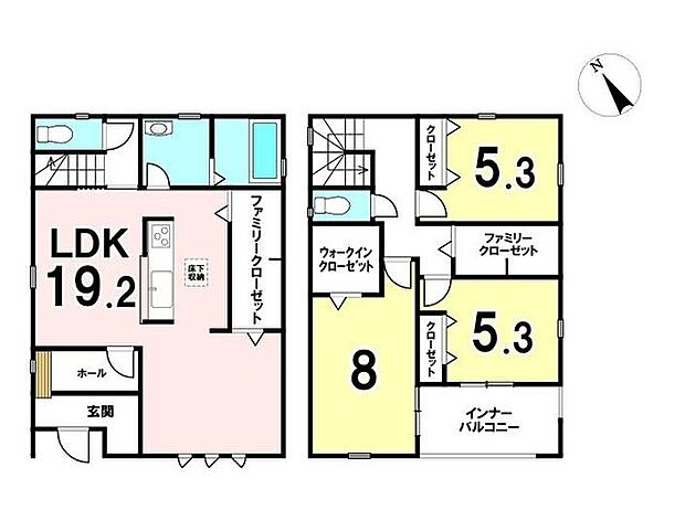 | 間取り | 3LDK 間取り内訳:リビングダイニングキッチン 19.2帖(1階)・収納(1階)・洋室 8帖(2階)・洋室 5.3帖(2階)・洋室 5.3帖(2階) |