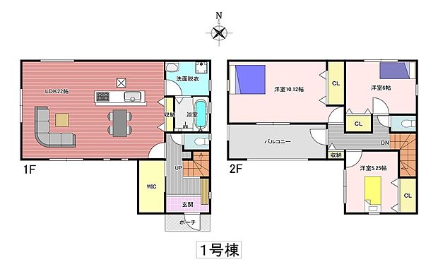 間取り内訳:リビングダイニングキッチン 22帖(1階)・洋室 5.2帖(2階)・洋室 6帖(2階)・洋室 10.1帖(2階)