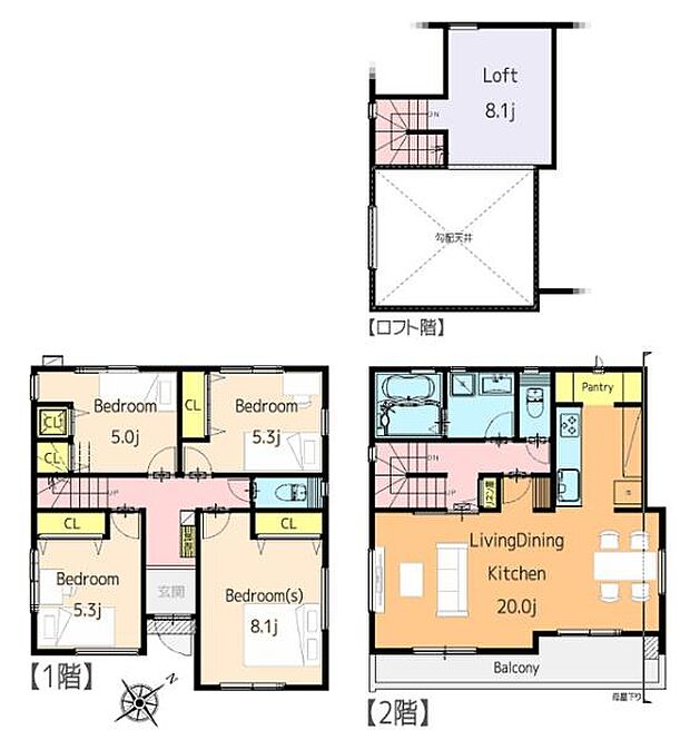 | 間取り | 4LDK 間取り内訳:洋室 8.1帖(1階)・洋室 5.3帖(1階)・洋室 5.3帖(1階)・洋室 5.3帖(1階)・リビングダイニングキッチン 20帖(2階) |