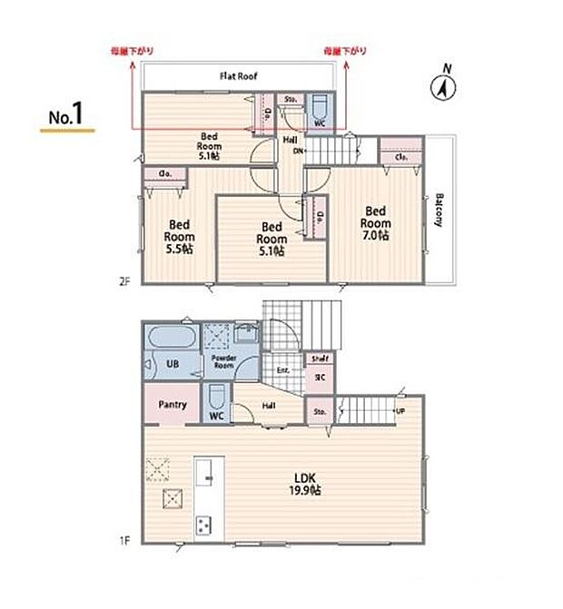 | 間取り | 4LDK 間取り内訳:リビングダイニングキッチン 19.9帖(1階)・洋室 7帖(2階)・洋室 5.5帖(2階)・洋室 5.1帖(2階)・洋室 5.1帖(2階) |