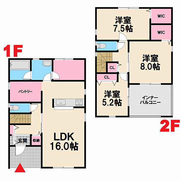 | 間取り | 3LDK 間取り内訳:リビングダイニングキッチン 16帖(1階)・洋室 8帖(1階)・洋室 7.5帖(2階)・洋室 5.2帖(2階) |