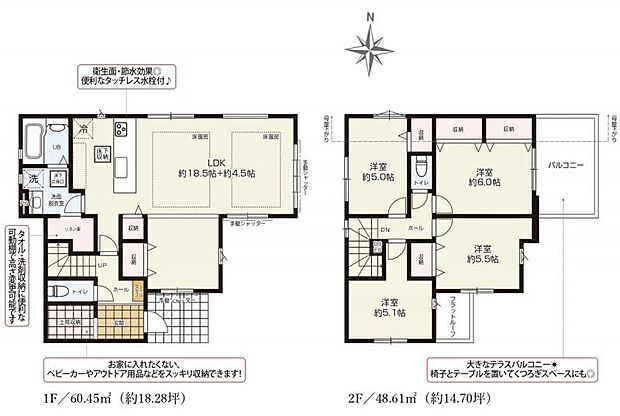 | 間取り | 4LDK 間取り内訳:リビングダイニングキッチン 23帖(1階)・洋室 6帖(2階)・洋室 5.5帖(2階)・洋室 5.1帖(2階)・洋室 5帖(2階) |