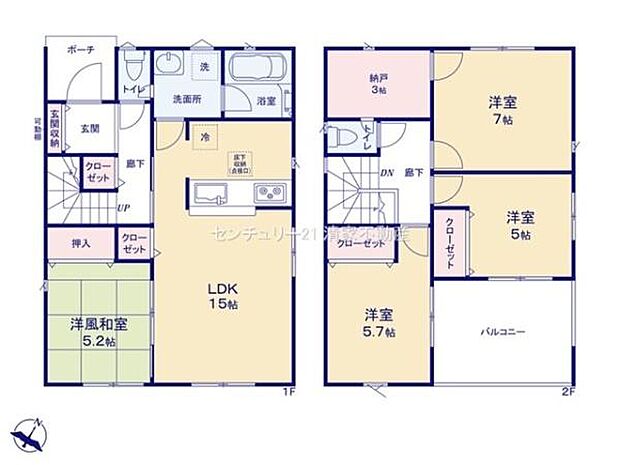 | 間取り | 4SLDK 間取り内訳:リビングダイニングキッチン 15帖(1階)・和室 5.2畳(1階)・洋室 7帖(2階)・洋室 5.7帖(2階)・洋室 5帖(2階) |