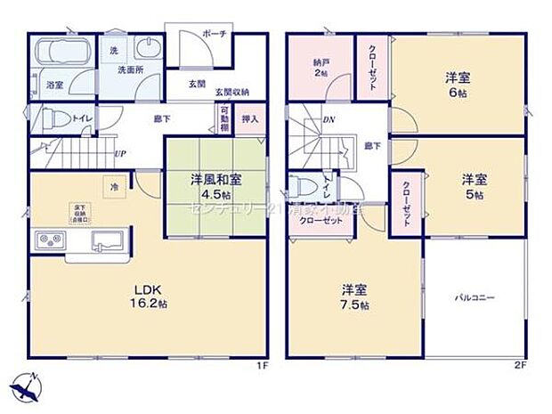| 間取り | 4SLDK 間取り内訳:洋室 6帖(2階)・洋室 5帖(2階)・収納 2帖(2階)・リビングダイニングキッチン 16.2帖(1階)・和室 4.5畳(1階)・洋室 7.5帖(2階) |
