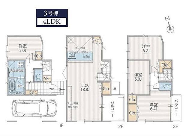 | 間取り | 4LDK 間取り内訳:洋室 5帖(1階)・リビングダイニングキッチン 18.8帖(2階)・洋室 6.4帖(3階)・洋室 6.2帖(3階)・洋室 5帖(3階) |