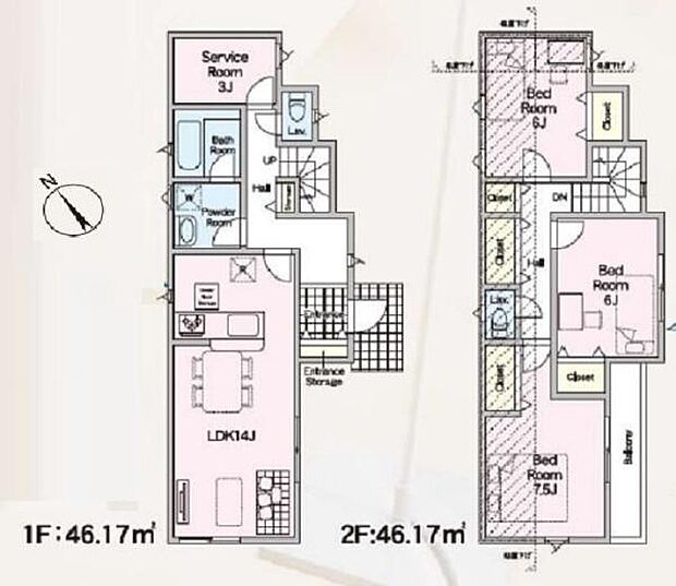 | 間取り | 3SLDK 間取り内訳:リビングダイニングキッチン 14帖(1階)・収納 3帖(1階)・洋室 7.5帖(2階)・洋室 6帖(2階)・洋室 6帖(2階) |