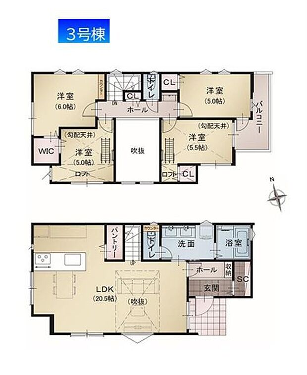 | 間取り | 4LDK 間取り内訳:リビングダイニングキッチン 20.5帖(1階)・洋室 6帖(2階)・洋室 5.5帖(2階)・洋室 5帖(2階)・洋室 5帖(2階) |