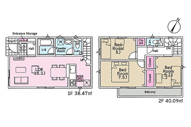 間取り内訳:リビングダイニングキッチン 15.3帖(1階)・洋室 5帖(2階)・洋室 5.2帖(2階)・洋室 7.5帖(2階)