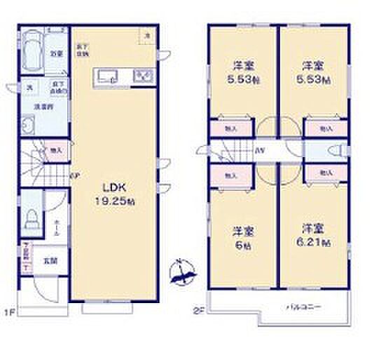 | 間取り | 4LDK 間取り内訳:リビングダイニングキッチン(1階)・洋室 6.2帖(2階)・洋室 6帖(2階)・洋室 5.5帖(2階)x2 |