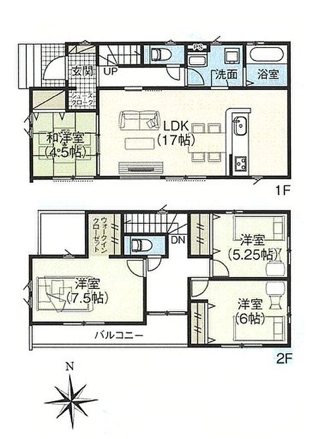 | 間取り | 4LDK 間取り内訳:リビングダイニングキッチン 17帖(1階)・和室 4.5畳(1階)・洋室 6帖(2階)・洋室 5.2帖(2階)・洋室 7.5帖(2階) |