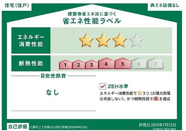 - 星マークの数が多いほどエネルギー消費性能が高いことを示しています。再エネ設備のない住宅は★0~★4の5段階評価、再エネ設備がある住宅は★0~★6の7段階評価となります。