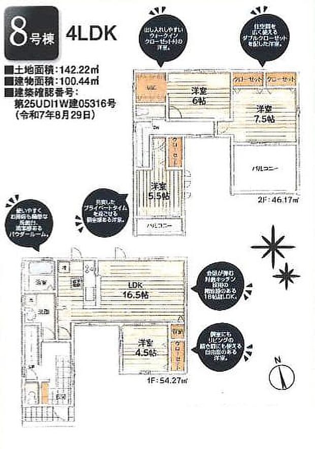 | 間取り | 4LDK 間取り内訳:リビングダイニングキッチン 16帖(1階)・洋室 4.5帖(1階)・洋室 7.5帖(2階)・洋室 5.5帖(2階)・洋室 6帖(2階) |