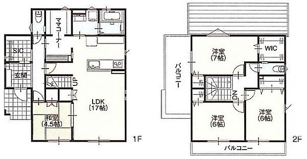 | 間取り | 4LDK 間取り内訳:リビングダイニングキッチン 17帖(1階)・和室 4.5畳(1階)・洋室 7帖(2階)・洋室 6帖(2階)・洋室 6帖(2階) |