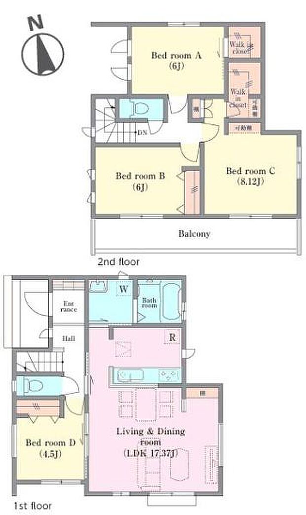 | 間取り | 4LDK 間取り内訳:リビングダイニングキッチン 17.3帖(1階)・洋室 4.5帖(1階)・洋室 8.1帖(2階)・洋室 6帖(2階)・洋室 6帖(2階) |