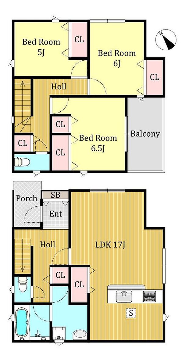 | 間取り | 3LDK 間取り内訳:リビングダイニングキッチン 17帖(1階)・洋室 5帖(2階)・洋室 6帖(2階)・洋室 6.5帖(2階) |