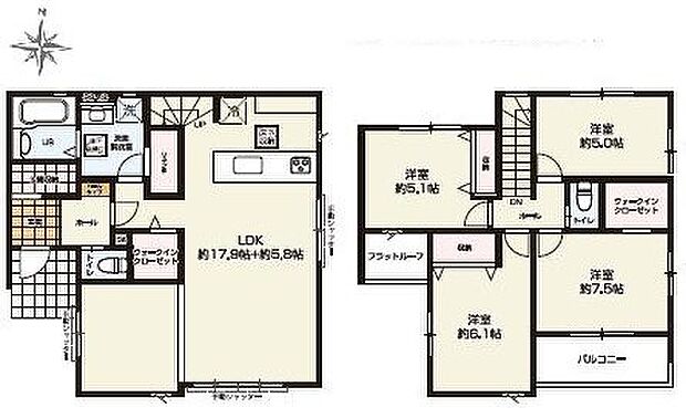 間取り内訳:リビングダイニングキッチン 23.7帖(1階)・洋室 5.1帖(2階)・洋室 6.1帖(2階)・洋室 7.5帖(2階)・洋室 5帖(2階)