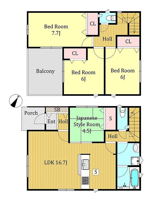 | 間取り | 4LDK 間取り内訳:リビングダイニングキッチン 16.7帖(1階)・和室 4.5畳(1階)・洋室 7.7帖(2階)・洋室 6帖(2階)x2 |