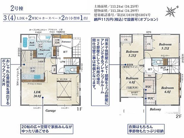 間取り内訳:リビングダイニングキッチン 20帖(1階)・洋室 5帖(2階)・洋室 6帖(2階)・洋室 11.2帖(2階)x2