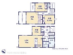 間取り内訳:洋室 5.3帖(2階)x2・洋室 9.7帖(2階)・リビングダイニングキッチン 16帖(1階)・洋室 4.5帖(1階)