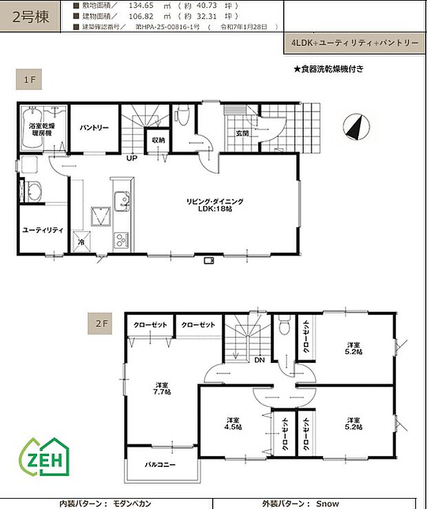 | 間取り | 4LDK 間取り内訳:リビングダイニングキッチン 18帖(1階)・洋室 4.5帖(2階)・洋室 5.2帖(2階)x2・洋室 7.7帖(2階) |