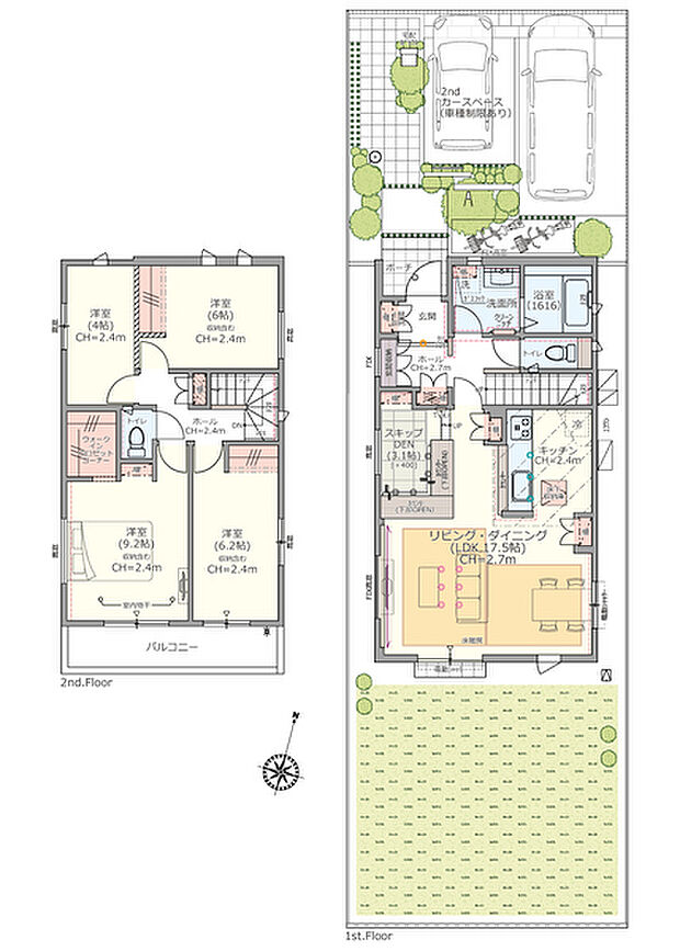 | 間取り | 4LDK(3LDK対応可※オプション)+スキップDEN+土間収納+ウォークインクロゼットコーナー ~ 5LDK(4LDK対応可※オプション)+土間収納+パントリー+2ウォークインクロゼットコーナー |
