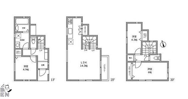 | 間取り | 3LDK 間取り内訳:リビングダイニングキッチン 14.3帖(2階)・洋室 6帖(3階)・洋室 4.9帖(1階)・洋室 4.3帖(3階) |