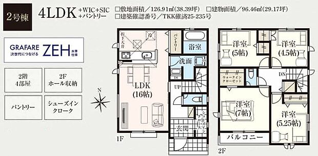 | 間取り | 4LDK 間取り内訳:リビングダイニングキッチン 16帖(1階)・洋室 5帖(2階)・洋室 7帖(2階)・洋室 4.5帖(2階)・洋室 5.2帖(2階) |