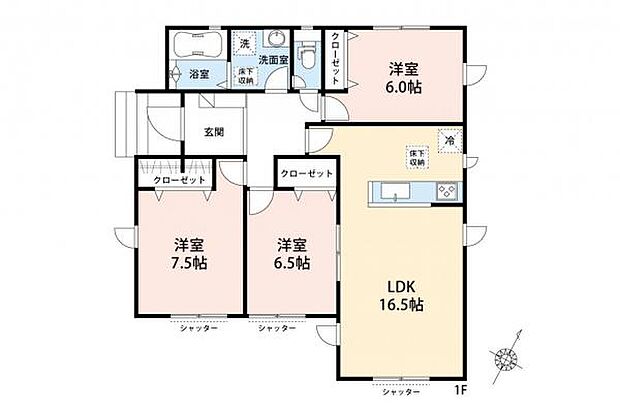 | 間取り | 3LDK 間取り内訳:リビングダイニングキッチン 16.5帖(1階)・洋室 7.5帖(1階)・洋室 6.5帖(1階)・洋室 6帖(1階) |