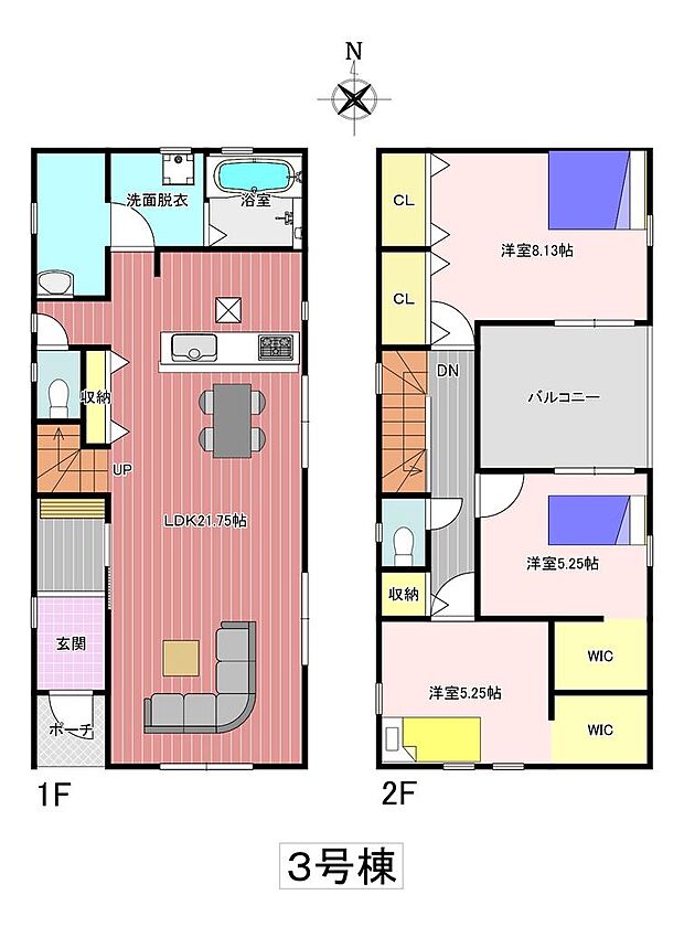 | 間取り | 3LDK 間取り内訳:リビングダイニングキッチン 21.7帖(1階)・洋室 5.2帖(2階)・洋室 5.2帖(2階)・洋室 8.1帖(2階) |