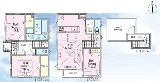 | 間取り | 3LDK 間取り内訳:洋室 6帖(1階)・洋室 5.1帖(1階)・リビングダイニングキッチン 14.6帖(2階)・洋室 4.4帖(2階) |