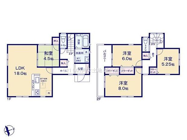 間取り内訳:リビングダイニングキッチン 18帖(1階)・和室 4.5畳(1階)・洋室 6帖(2階)・洋室 5.2帖(2階)・洋室 8帖(2階)