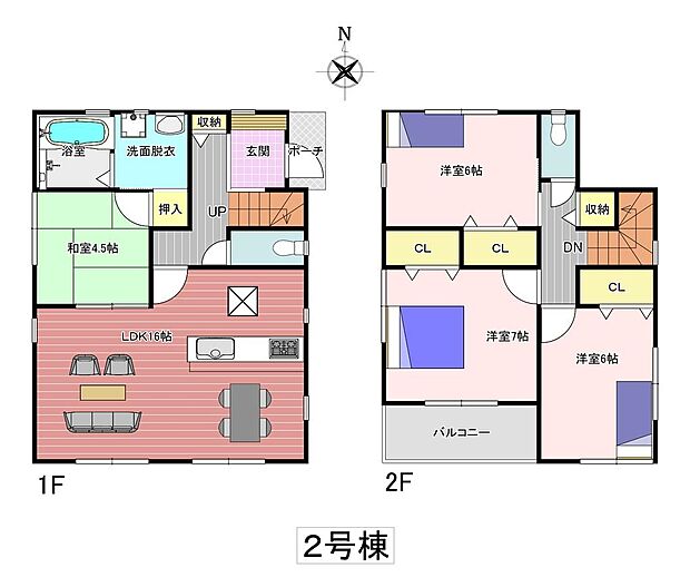 間取り内訳:洋室 7帖(2階)・リビングダイニングキッチン 16帖(1階)・和室 4.5畳(1階)・洋室 6帖(2階)・洋室 6帖(2階)