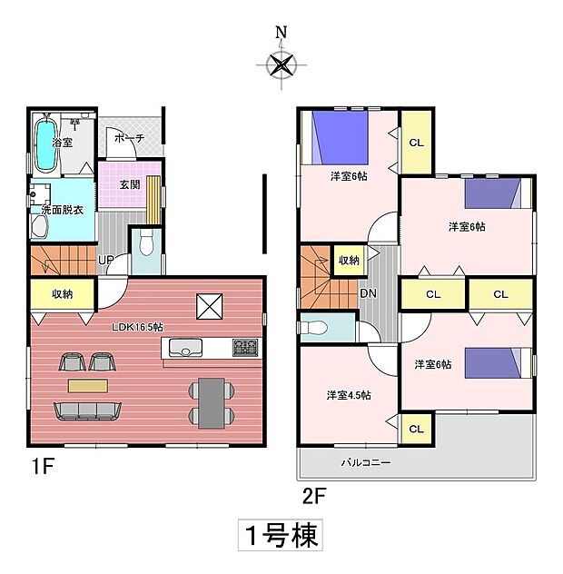 | 間取り | 4LDK 間取り内訳:リビングダイニングキッチン 16.5帖(1階)・洋室 4.5帖(2階)・洋室 6帖(2階)・洋室 6帖(2階)・洋室 6帖(2階) |